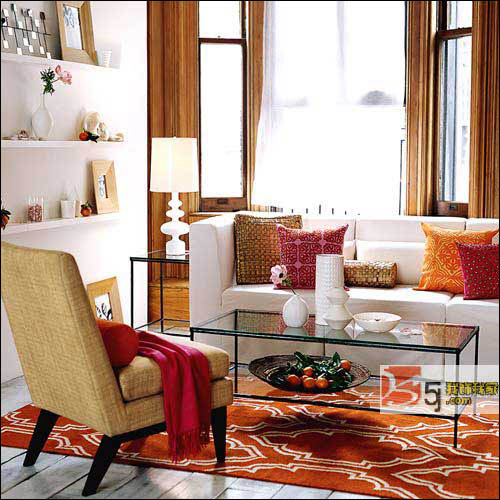 2.利用配色增加寬闊感??梢砸园咨珵橹饕难b飾色,墻、天花板、家具都用白色,稍加淡色的花紋。生活用品也選用淺色,最大限度地發(fā)揮淺色產(chǎn)生寬闊感的效果。再適當(dāng)采用些鮮明的綠色、黃色,可使寬闊感效果更好。