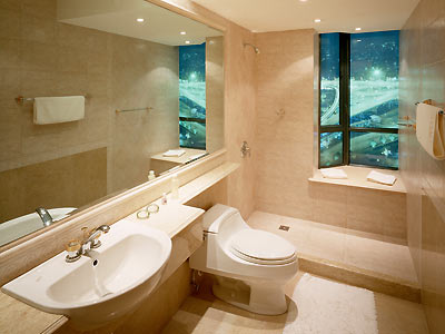 浴室中最理想的色調(diào)是粉色系。例如:粉紅、淡綠、淡藍(lán)及桃紅色等。其次則是奶油色系,或是一些中性色。如:黑色及白色,裝飾物及毛巾等配件則可選擇強(qiáng)烈的對(duì)比色系。