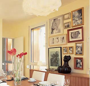 每一張照片都有一個故事。周末的時候,一家人圍坐在餐桌旁,邊吃飯邊話說當年,合著窗外暖暖的陽光,其樂融融。幾乎貼滿墻壁的照片,沒有什么規(guī)則地排列著,花瓶、餐具、桌椅等物品雖然很多,看似復雜,卻在顏色與形式上統(tǒng)一成對美好歲月的回憶和感謝。