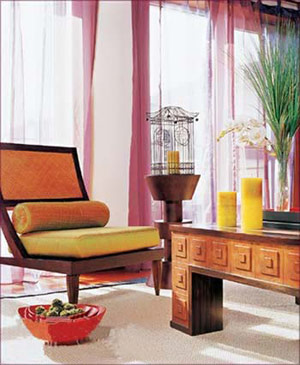 靠窗而臥,耳邊有輕柔的鳥鳴,窗外的自然也可以鎖住了。一些傳統(tǒng)符號常常成為現(xiàn)代設計師的法寶,像體態(tài)碩大的鳥籠、輕薄的紗簾、靠背椅的竹篾質感、還有柜體表面的簡潔紋飾都是現(xiàn)代居住空間中的傳統(tǒng)點綴物,盡管是開敞透亮的自由空間卻仍不時散發(fā)出東南亞熱帶雨林的濕熱氣息。