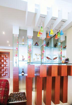 用不同的吊頂劃分各個空間是這一案例很有特色的地方。摒棄了以往墻面、柱子等生硬的劃分空間的方法,創(chuàng)造性地設(shè)計出不同的吊頂來區(qū)分功能區(qū),這是保證視覺通透的重要設(shè)計。