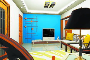 在客廳中,兩個(gè)臥室門和衛(wèi)生間的門對著客廳,從視覺上感覺比較凌亂。而衛(wèi)生間的門正在電視背景墻面上,有了門,這面背景墻顯得長度不夠,也不規(guī)整,同時(shí)坐著看電視時(shí)正對著衛(wèi)生間的門,從心理和衛(wèi)生角度來講,都不合理。所以把衛(wèi)生間的門做成了隱形門。主要是把整個(gè)墻面做成一個(gè)造型,根據(jù)客廳的整體風(fēng)格,用深藍(lán)色作為背景色,形成客廳的一個(gè)主題墻面。同時(shí),利用簡單的線條和木質(zhì)裝飾,做成了隱形門。