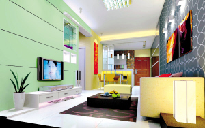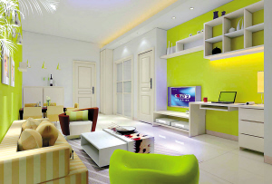 考慮房主是年輕活潑的女孩,明庭中采用活潑明亮的主色調(diào),把電視背景墻刷成果綠色。其余的功能也在這面墻上做文章:上邊設(shè)計(jì)了裝飾柜,緊鄰小電視柜旁邊再并排放書桌??臻g利用充分、有序。