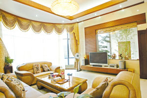 從花園走入到客廳,眼前則是另外一種感覺,真皮的沙發(fā),在燈光的照射下,彰顯出一種豪華的光環(huán)。若大的落地窗更是讓對面的黃旗山一覽眼前。設(shè)計(jì)師表示,設(shè)計(jì)的風(fēng)格與軟裝的配置很重要,因?yàn)轫n先生的客廳比較大,所以所擺設(shè)的家具就要對稱,這樣更顯得大氣。