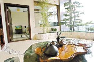 觀光電梯將我們送上到了韓先生的家。首先映入眼前的是韓先生家的入戶花園,近10平方米多的花園給人的感覺是自然、清新,不用入客廳就可以與客人一起在花園品茗或是欣賞美麗的黃旗山公園,想必這是一種極其少有的享受吧。