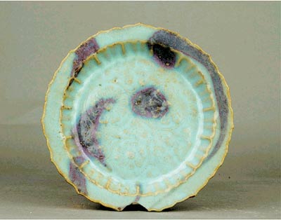 殊不知宋代鈞窯還有另外一種裝飾手法--印花。在許昌博物館的歷史文物陳列中就有一件印花的宋代鈞窯瓷盤(上圖).這件出土于河南禹州的宋代鈞窯瓷盤直徑20厘米,底部留有3顆支釘痕,是采用通體施釉支燒法燒制而成的。盤內(nèi)除大片的茄皮紫斑外,在盤心還印飾了3朵團菊,讓美麗的色彩錦上添花。