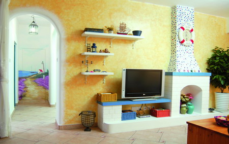 ●空間亮點二:圓拱帶出海洋味。不管是書房的開放入口,還是墻上的裝飾閣,整體都是圓拱的形狀。這是地中海風(fēng)格的典型特征之一。制作過程比較麻煩,先要用木板支模,然后用紅磚砌出拱門,最后用水泥抹面,盡量把線條抹圓潤一些;然后刷上白色就可以了。