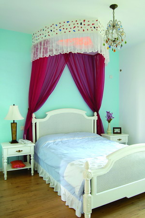 ●空間亮點:Lulu自己住的臥室被她裝扮得像一個小公主的睡房。淡淡的藍(lán)色背景墻下,一顆紅色的心天天俯望著夢里的小女孩,旁邊,還有輕紗圍繞。這樣的設(shè)計讓很多閨中密友羨慕、贊嘆,可也有人說它和整體的愛琴海風(fēng)格不搭配,聰明的讀者,您認(rèn)為呢?