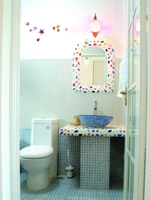 ●空間亮點:不忘繽紛琉璃。主衛(wèi)里的鏡框、洗手臺面和浴缸臺面是非常具有愛琴海風(fēng)格的細(xì)節(jié)。看到那晶瑩的水晶就有涼涼的感覺。這樣的效果對施工要求很高:首先要用白水泥鋪一層,然后把玻璃馬賽克鑲嵌在上面,再用填縫劑抹平表面。
