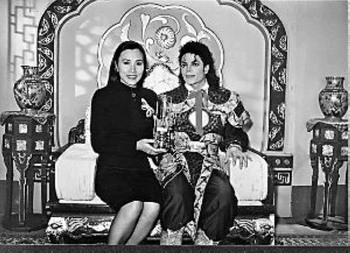 汪明荃代表TVB送贈(zèng)一個(gè)電視顯像管給邁克爾·杰克遜作紀(jì)念,兩人坐在龍椅上合照
