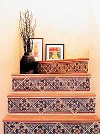 拱形與淡白的色調是地中海風格的突出形象。這個樓梯是突出地中海風格的一個亮點,做法是扶手用磚徹,再用水泥沙漿披一層,最后刷上淡黃色的防水涂料。踏步采用與實木地板一樣的材料,下面裝飾菱形圖案的瓷磚。