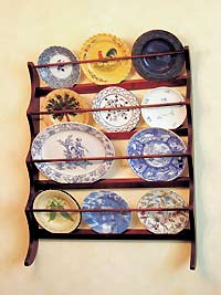 把家中累積的青色細瓷盤放在木架上作為墻飾。