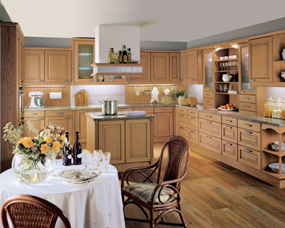 鄉(xiāng)村風(fēng)格的廚房櫥柜多以實木為主,因為它更接近自然的環(huán)抱,材質(zhì)以松木、橡木等最為精典,這種風(fēng)格的代表以歐式廚房及美式廚房為主,歐式鄉(xiāng)村風(fēng)格在外表上更細膩,色彩較為豐富;美式則更為純樸,寬大的中心島代表了主人對廚房生活的重視。