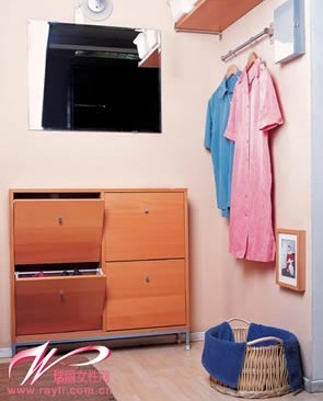 進門的玄關空間,可以放置一個多功能的儲物柜,分別收納鞋子、小件的衣物、手套等物品。在空白墻壁上安裝掛鉤和擱架,收納進門后脫下的衣物,方便尋找。
