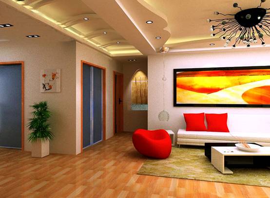 再來看另一間相似于此件做品的經(jīng)典之作,紅得似火,黃得艷麗,正是設(shè)計師在這客廳動的大手筆,別致的吊燈更為整個大廳的造就了幾分活躍,生動。
