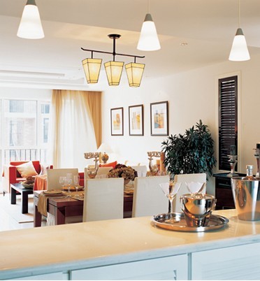 在客廳里設(shè)置一個(gè)小巧玲瓏的吧臺(tái),已經(jīng)成為一種時(shí)尚。如何讓放置在客廳的吧臺(tái),給人一種異樣的情調(diào)和華貴感,最經(jīng)濟(jì)、有效的辦法是運(yùn)用光線的錯(cuò)落,來(lái)營(yíng)造出華貴的氣氛。不妨在客廳一角的小吧臺(tái)上方,安裝幾盞射燈,在以名酒和別致酒杯的精心點(diǎn)綴,一個(gè)風(fēng)趣、搶眼的小吧臺(tái),頓時(shí)展現(xiàn)在您眼前。