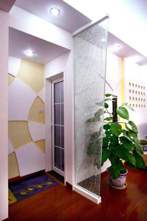 、中國的傳統(tǒng)大宅院入門之處均設(shè)有大型玄關(guān),而現(xiàn)代都市的住宅普遍面積狹窄,若再設(shè)置傳統(tǒng)的大型玄關(guān),則明顯會感覺空間局促,難以騰挪。所以折衷的辦法是用玻璃屏風(fēng)來作間隔,這樣既可防止外氣從大門直沖入客廳,同時也可令狹窄的玄關(guān)不顯得太逼仄。