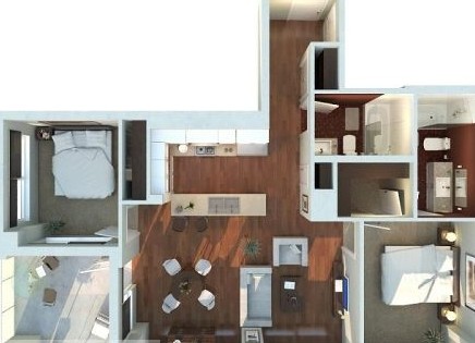 這是一套兩房?jī)蓮d兩衛(wèi)的公寓,因?yàn)槲魇讲惋嬘糜土枯^少,所以廚房都作成敞開式,這在下面兩個(gè)案例中也是。這樣做的好處就是建筑師進(jìn)行室內(nèi)房型設(shè)計(jì)的時(shí)候可以避免考慮廚房的影響,而只要增加客廳面積就可以開辟出一塊烹飪區(qū)域,并且,客廳、餐廳、廚房聯(lián)體的方式也使這一區(qū)域的利用率、視覺感覺都能達(dá)到最大。