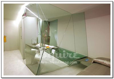 最另類的玻璃利用哲學(xué):一掃臥室在人們心中只是安靜的休息場所的形象,嘗試充分利用玻璃的反射效果來營造變幻莫測的閣樓空間效果。最具偽裝效果的家具:你發(fā)現(xiàn)浴缸了嗎?仔細(xì)看看洗手池的后面。最大膽的顏色選擇:把床單搞得像調(diào)色板一樣的復(fù)雜很簡單,但那叫惡俗而不是大膽,最大膽的顏色選擇莫過于這間屋子床上的亮銀色,這才叫真正的大膽。