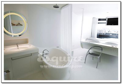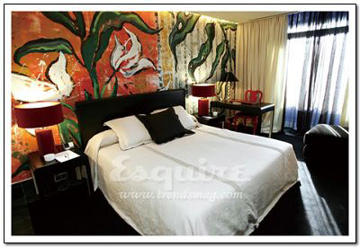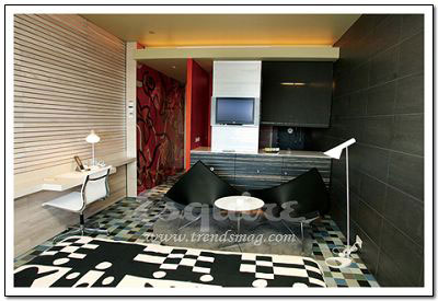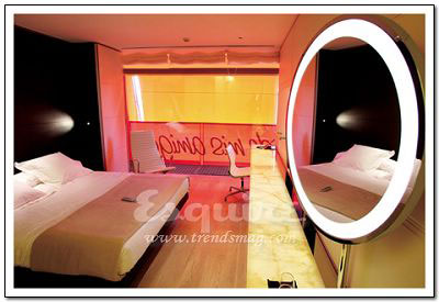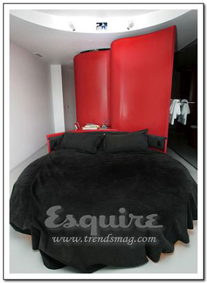 深處其中最大的感覺:流動。Zaha.Hadid在這套房間中以數(shù)字設(shè)計的新發(fā)展為基礎(chǔ),用流暢但不規(guī)則的墻壁線條,體現(xiàn)了空間流動性的特色,好像一個漂亮的模具。最不起眼的關(guān)鍵所在:電視機下的白色遙控器。它控制著屋內(nèi)所有內(nèi)嵌在墻壁內(nèi)的尖端數(shù)字設(shè)備,從激光燈到數(shù)字電視。最值得學(xué)習(xí)的搭配:橘黃色鑲黑的現(xiàn)代主義印花床單。