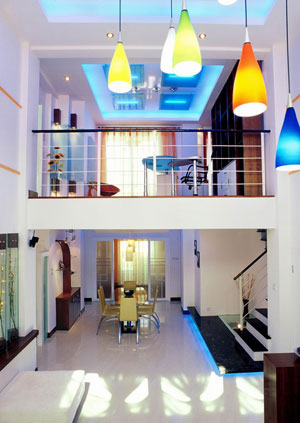 色彩有空間感和深度感,亮度高的色彩在距離上感覺近些,亮度低的色彩在距離上感覺遠些;亮度高的暖色給人以膨脹感,亮度弱的冷色給人以后退、擴充的感覺。因此,低矮住房墻壁及天花板的色彩應選用冷色,如青色、藍色等,而盡量少用紅、橙、黃等暖色。
