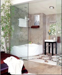 1、拆除主臥與主衛(wèi)的隔墻,以大面積的鋼化玻璃間隔,完全的透明、開放式。浴室的地面和墻面處理是非常特別的:首先將鐵絲網(wǎng)固定普通水泥找平地面,然后用高標號水泥抹平,此時注意一定要一次做完,否則容易出現(xiàn)裂紋。水泥抹平后要陰干----即反復灑水晾干固化地面,最后用地平漆刷4~5遍即可,要想有更獨特的地面效果,還可在上面鋪些鵝卵石和大理石。墻面的制作簡單些,只需用高標號水泥找平墻面,然后再刷2~3遍地平漆即可。