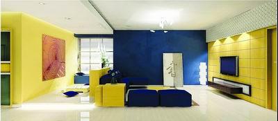 因?yàn)榉块g的面積本身很小,假如做出一個(gè)硬隔斷的話就顯得空間很局促,所以我們首先在地板上,選同種材質(zhì)和顏色的木地板,從地面上看兩者比較協(xié)調(diào),視覺效果比較統(tǒng)一。而在房間的顏色上,選擇黃和藍(lán)兩種互補(bǔ)的顏色,既對(duì)立又統(tǒng)一。客廳的兩面墻用大面積的藍(lán)色和黃色,對(duì)比非常鮮明,在家具上,又用藍(lán)色沙發(fā)和黃色的茶幾、角柜交叉點(diǎn)綴??蛷d茶幾下用淺色地毯,既不和木地板沖突,又能劃分出客廳的主要范圍。休閑區(qū)域主要以黃色為主,和客廳的電視墻顏色互相呼應(yīng),達(dá)到最大程度的統(tǒng)一,地臺(tái)上只用了兩個(gè)藍(lán)色靠墊作為點(diǎn)綴,起到畫龍點(diǎn)睛的作用。