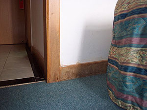 “防潮還得講究施工時候的工序!”艾嘉裝飾的負責人提醒,如果瓷磚、門檻石、門套的施工先后次序搞錯了,水汽也可能滲入門套里去。他說,正確的施工工序應該是先鋪地磚,然后做門檻石,再在門檻石上面做門套,而且門檻石的寬度要跟原始門洞一樣寬,按照從左到右的方向安裝上門套才行,盡量避免門套和含有水分的材料直接接觸。