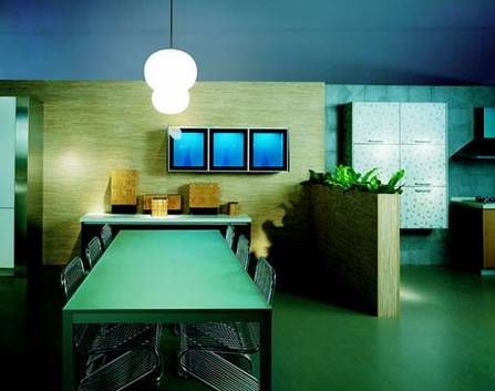 輕松舒爽、心曠神怡的色彩。綠色是永遠(yuǎn)用不完,永遠(yuǎn)不會讓人感到厭煩的主題,因為它的每一點(diǎn)變化,都對應(yīng)著自然給人類的印象,所以綠色適合所有喜歡它的人。從淡綠轉(zhuǎn)化為灰綠,然后暗紫,完成室外到室內(nèi)的過渡,對應(yīng)了人的視覺對空間的自然反應(yīng)。淡綠如田野的地板,黃色如秋葉的柜體,墨綠如松針的臺面,構(gòu)成一幅自然景色,使人心情豁然開朗。淡綠與淡藍(lán)的配合,則使廚房布滿盎然生氣。生活在淡綠的空間里,夢都是清新的。明快而錯落的綠,讓人仿佛來到青山翠谷。