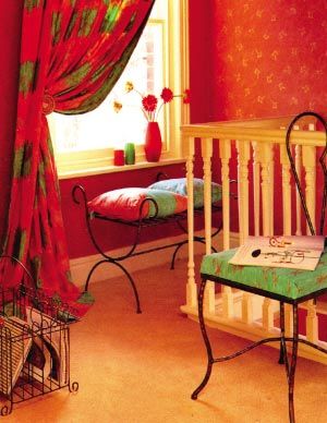 比如,一面白色的墻壁,可以作為以紅褐色與藍(lán)色為主色的現(xiàn)代繪畫的背景,相鄰的墻,飾以濃重的中國(guó)紅,與房間內(nèi)的藍(lán)色沙發(fā)形成鮮明的對(duì)比。一盞帶有土色燈罩的大燈在紅色的墻壁上勾勒出圓錐形的色塊。