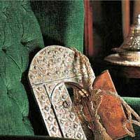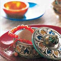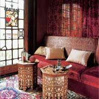 利用先在胡桃木上挖出凹槽,然后鑲嵌貝殼的傳統(tǒng)手工藝方法做成的八角木幾,上面擺放的托盤(pán)、玻璃杯和臺(tái)燈,都是典型的摩洛哥風(fēng)格。這一切與果敢而華麗的藝品搭配,營(yíng)造出艷麗奪目的感覺(jué)。有著條紋圖案的金色靠墊,是用綢緞面料做成的。