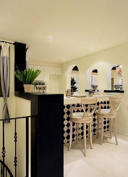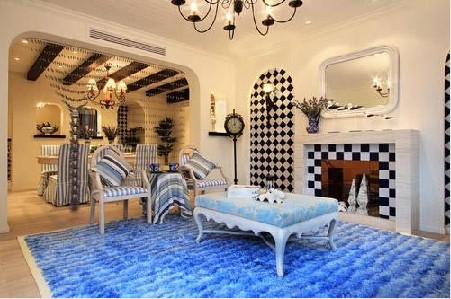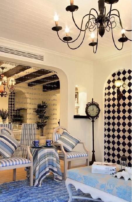 概要:   濃郁地中海特色淺淺的具有不同質(zhì)感與色相的白與藍色條紋,在家具、墻面、頂棚、梁柱等各個層面化解延伸,使整個居室充滿了視覺的清新感,呈現(xiàn)質(zhì)樸、唯美、慵懶的空間氣質(zhì)。鐵藝的立式座鐘整個空間唯美浪漫。  **厚實的木質(zhì)家具,蘭白相間的條紋布藝,優(yōu)美的吊頂弧線、典雅的吊燈似乎都在演繹著浪漫。獨特的設(shè)計讓空間得以擴展與延伸,格調(diào)更具浪漫情懷。