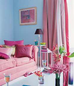 為這里的客廳布置了粉色的布藝沙發(fā),色調(diào)很輕快,這種形式是年輕女士們所鐘愛(ài)的。墻面則粉刷成淺藍(lán)色,配以白色的木踢腳板,和粉色的窗簾結(jié)合在一起,組合成浪漫的氛圍。其他的家具則多用十分簡(jiǎn)潔的線條和白顏色,營(yíng)造現(xiàn)代感的清新房室。
