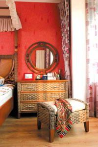 這套新房的臥室中采用大量傳統(tǒng)的紅色,紅色的床具,配上紅色的布幔,熱烈中不失浪漫和溫馨,配合整套居室的中式設(shè)計(jì),和諧中有種深宅大院的感覺(jué),而這種神秘的氛圍恰恰是年輕人酷愛(ài)的。假如新婚過(guò)后看膩了紅色,不妨更換一下布藝的顏色,整個(gè)居室就能輕而易舉地?fù)Q成另外一種風(fēng)情。