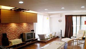 為了遮蓋原有衡梁?jiǎn)栴},天花板采用15公分射燈以及平面式層板設(shè)計(jì),后再利用胡桃木壓條片做局部天花板造型變化。