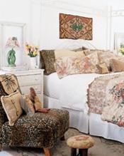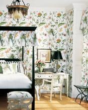 紛繁富麗的墻布令人感覺仿佛走進(jìn)野花遍地的樹林,林中蕭蕭的樹葉聲中傳來清幽的鳥鳴,黑胡桃木的床好象就擺在樹林中,白色的床罩和黑白條紋的靠枕簡潔而理性,與漂亮的墻布形成鮮明而生動的對比。