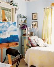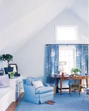 最適合于夏日午后時光流連的舒適小床,簡潔的鐵藝床頭富于美感,手感厚實(shí)暖和的白色床罩和窗簾,搭配淺藍(lán)色的墻壁和家具,氣氛寧靜。大小不同的靠墊有很好的裝飾效果。