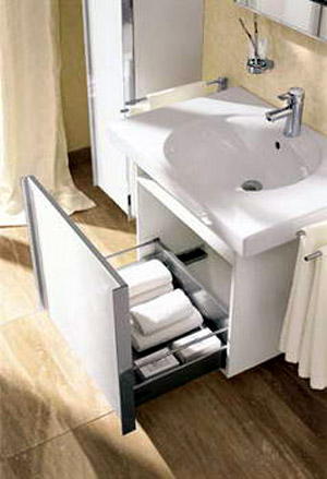 充分利用洗臉池下面的空間。可以在其中設(shè)計(jì)一個(gè)儲(chǔ)物柜,放入毛巾、牙刷、牙膏、及各式洗浴洗頭用品,也可以用來儲(chǔ)存衛(wèi)生紙和衛(wèi)生巾。