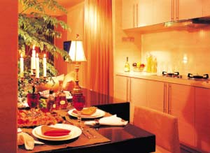2.廚房就在客廳旁,用一個頗有個性和意境的屏風分隔,既節(jié)省了空間,又調(diào)動出整個房子的味道。