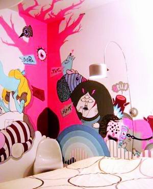 另外,涂鴉不僅僅只是拘泥于整體墻面的裝飾,可以請(qǐng)涂鴉畫(huà)師根據(jù)室內(nèi)的家具風(fēng)格設(shè)計(jì)一種涂鴉造型,然后把這種造型形式統(tǒng)一運(yùn)用的家裝中的各個(gè)方面。