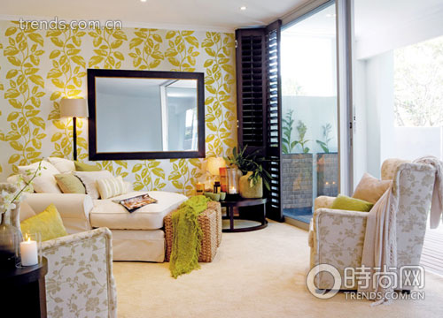 布藝沙發(fā)也同樣遵循了花色與純色混搭的原則,奶白色的雙人沙發(fā)用淺灰綠的靠包來點綴,分坐兩旁的單人沙發(fā)則使用枝葉與花朵的暗紋來處理,旁邊配上深色的小茶幾,精致的圓肚細頸花瓶里悄悄探出一枝素雅的白色蝴蝶蘭,跟玻璃罩內點燃的白色蠟燭相映成趣。