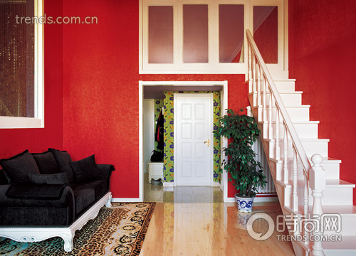 大廳的墻是紅色,很扎眼,但家具是白色的,窗簾是黑色的,這幾種顏色搭配起來特別鮮明。樓道吉米選擇綠配紫,屬于對(duì)撞的顏色里最沖突的,吉米說只有這樣才會(huì)把主題包括主人的個(gè)性充分表達(dá)出來,非暖即冷,反正不會(huì)選擇中庸。