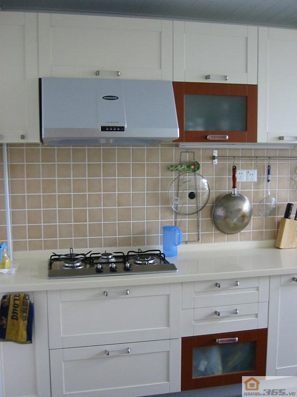櫥柜是廚房里收納物品的重要組成部件,小到杯、勺、碗筷,大到炒鍋、微波爐等,若想節(jié)省地方,又井然有序,全倚仗它的合理安置。為充分利用空間,在地柜與吊柜的間隔墻面上,可以安裝一兩個用于懸掛的壁式不銹鋼杯鉤、調料架、盤架等,還可放置微波爐、消毒柜,或增加擱板收納常用的調味品等。而在櫥柜門板上也可以釘裝一些掛鉤或折疊式掛桿來懸掛物品。若想不占用臺面的位置來安放家用電器,則可以把消毒柜、微波爐等內置于柜內。