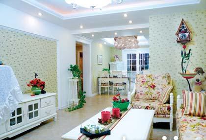 客廳的沙發(fā)是時(shí)下很流行的布藝與實(shí)木結(jié)合的款式,大花朵布藝與白色外框搭配很大氣。電視柜、鞋柜、茶幾、餐桌椅,每一件家具都是白色的,用花瓶、桌旗等飾品進(jìn)行點(diǎn)綴,顯得既整潔又不呆板。