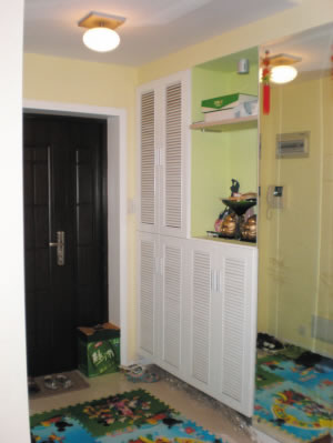 概要:            百葉門  慣用做法:采用百葉門。這是一般人家裝修玄關(guān)鞋柜的慣用手法,就算業(yè)主不主動說,十個木工有九個都會按照慣性思維做成百葉門。優(yōu)點:透氣性好,裝飾效果強。缺點:由于百葉是有縫隙的,鞋子放在里面很積灰,不干凈的鞋子擺里面,臭味會竄出來,如果客人來了,一進門就聞到不潔的味道,對這個家的印象分就會大打折扣。