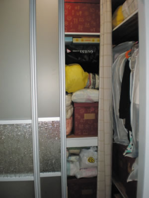 已經(jīng)安裝了移門的走入式衣柜,可以在移門上安裝防塵條,增加密封性。換季的衣物裝在箱子里再放進去,在每個箱子上貼上小紙條區(qū)分衣物。當(dāng)季衣物可以模仿服裝店的做法,為每件衣服套一個透明的掛衣袋。