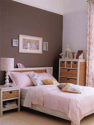 粉紅色的墻面定下整體基調(diào),給人以朦朧的浪漫感覺(jué)?;野咨蛎靥?,以及白色窗簾與粉紅色過(guò)度十分自然。白色的床邊小桌和柜子仍然帶藤制抽屜,桌上放有藍(lán)色托盤(pán)和藍(lán)色臺(tái)燈,是整體色調(diào)中活潑的一筆,柜子上飾以小圓鏡、藍(lán)色花瓶和小花枝?;野咨拇采细惨苑奂t色的床罩,白色床單、白色枕頭、藍(lán)、粉色小靠墊,溫暖而舒適。