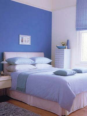 主題墻面為色彩鮮明的水藍(lán)色,墻壁正中是白色小像框,其余墻壁采用灰色,很好地襯托了主墻面。床上鋪以白色床單和藍(lán)色薄被以及藍(lán)色枕頭,床邊柜上擺有藍(lán)色托盤(pán)和藍(lán)色花瓶,繼續(xù)強(qiáng)化主題色調(diào)??傮w感覺(jué)藍(lán)色灄人心魄,其余色調(diào)的搭配是對(duì)這種感覺(jué)的提升。