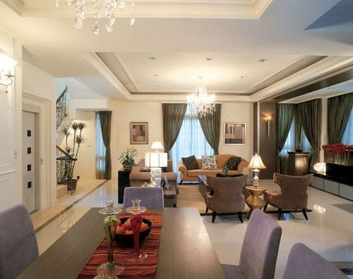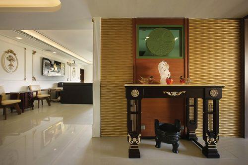 下圖是兩戶集成的,藉由玄關(guān)與端景分隔左右客、餐廳。設(shè)計師與屋主在溝通往來上花了相當(dāng)多的時間,希望將每一個細(xì)節(jié)都能夠結(jié)合屋主對風(fēng)水以及對設(shè)計的喜好,整體設(shè)計走向偏向沉穩(wěn)的新古典風(fēng)格并融合禪風(fēng),本身屋主喜愛新古典與禪風(fēng)的味道,但這兩者之間結(jié)合不易,因此設(shè)計師在兩者之間透過色系的運用、線條的比例、材質(zhì)的使用、空間格局的配置、家具的搭配,讓兩者取得平衡。