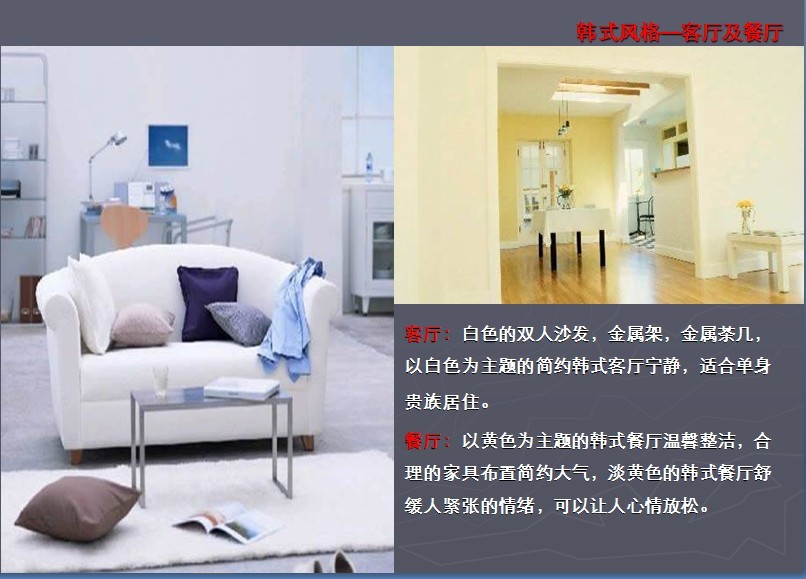 概要: 韓式裝修風(fēng)格大盤點(diǎn)韓式裝修風(fēng)格大盤點(diǎn)  韓式田園風(fēng)格可能是大多數(shù)年輕女孩比較喜歡的噢,它的重要元素是色調(diào)以柔和浪漫的粉色為主,浪漫的蕾絲、綠色植物、經(jīng)典的白色家具、隨處可見的卡通娃娃、毛絨地毯等裝飾?! 】蛷d:白色的雙人沙發(fā),金屬架,金屬茶幾,以白色為主題的簡約韓式客廳寧靜,適合單身貴族居住。